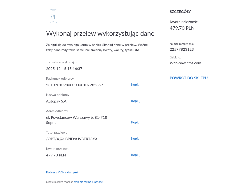 Jeśli jesteś firmą która nie może płacić online lub po prostu nie masz dostępu do banku przez internet to doskonałym rozwiązaniem są druczki płatności. Taki druczek bez problemu wygenerujesz samodzielnie a następnie na jego podstawie dokonasz płatności w banku czy na poczcie.