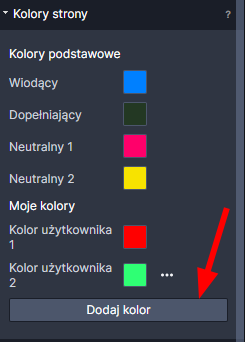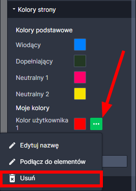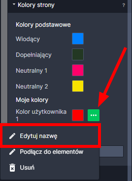 Palety kolorów tworzą się automatycznie podczas utworzenia nowej strony. Paletę kolorów zmieniamy klikając na aktualną paletę i zaznaczenie innej palety kolorów, natomiast kolor w paletach zmieniamy zgodnie z punktem "Edycja istniejącego kolor".
