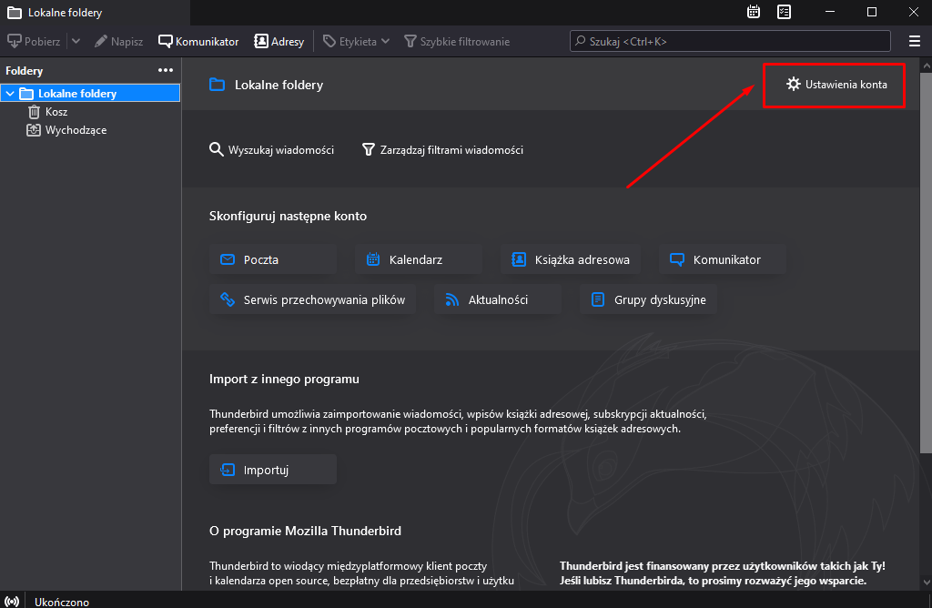 1. Otwórz program Thunderbird. Jeżeli nie masz podłączonego żadnego konta przejdź do punktu 4.