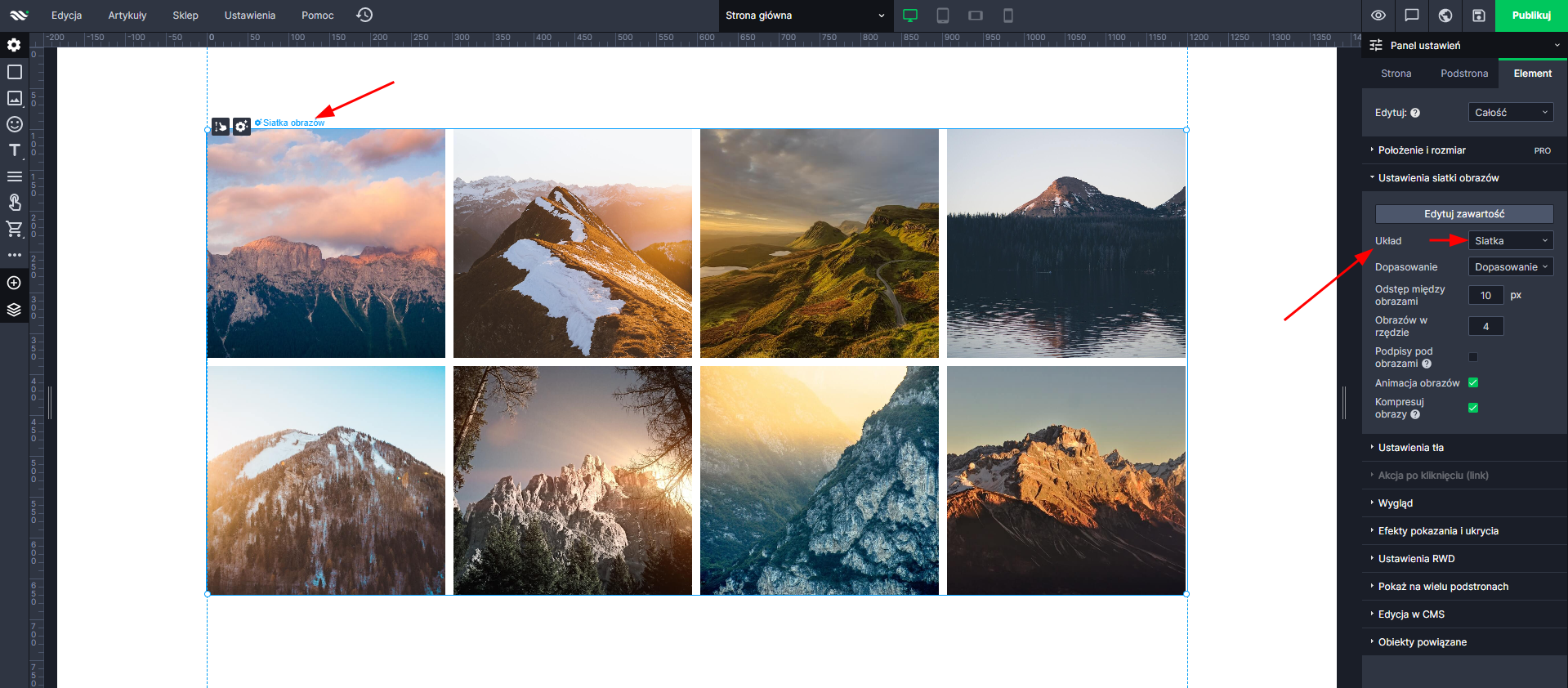 W ustawieniach elementu zmienisz też układ swojej siatki obrazów. Możesz wybierać spośród: