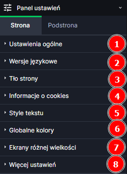 Panel ustawień w naszym kreatorze pełni najważniejszą role, za jego pomocą możesz zmieniać wyświetlanie się elementów na stronie, oraz zarządzać wyglądem całej strony jak i podstrony.