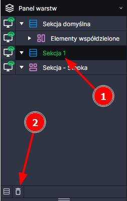 Sekcje możemy usunąć klikając przycisk "Delete" znajdujący się na klawiaturze oraz możemy to wykonać z poziomu naszego kreatora klikając w tę ikonę po wcześniejszym zaznaczeniu sekcji do usunięcia.