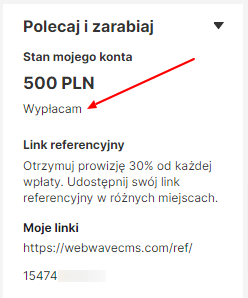 Uzyskane w ten sposób środki możesz przeznaczyć na usługi WebWave lub jeśli uzbierasz co najmniej 500 zł, wypłacić je na swoje konto bankowe.