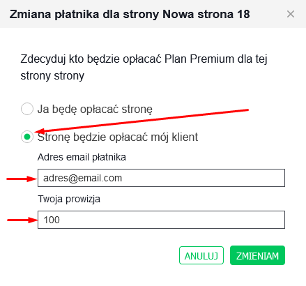 Jeśli tworzysz strony dla innych i chcesz, by opłata za twoją pracę następowała od razu przy płatności klienta, bez rozliczania się z nim indywidualnie, możesz dodać własną prowizję do rachunku, który otrzyma twój klient. Prowizja będzie widoczna tylko dla Ciebie - rachunek wysłany do klienta będzie zawierał tylko pełną kwotę, bez informacji o wysokości prowizji.
