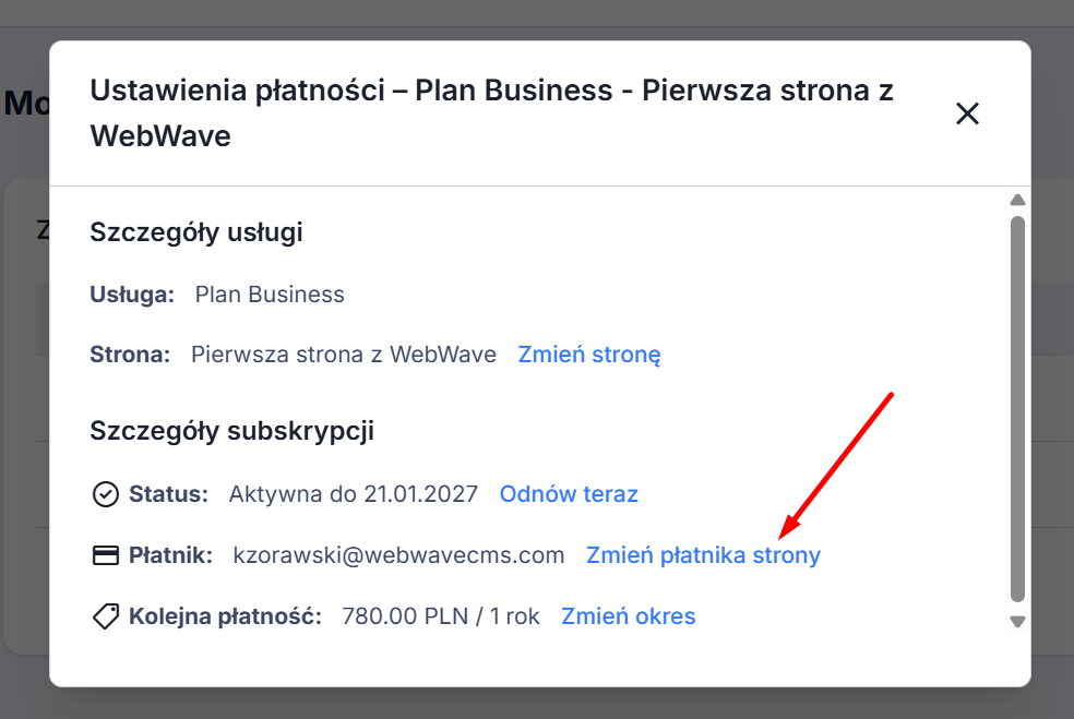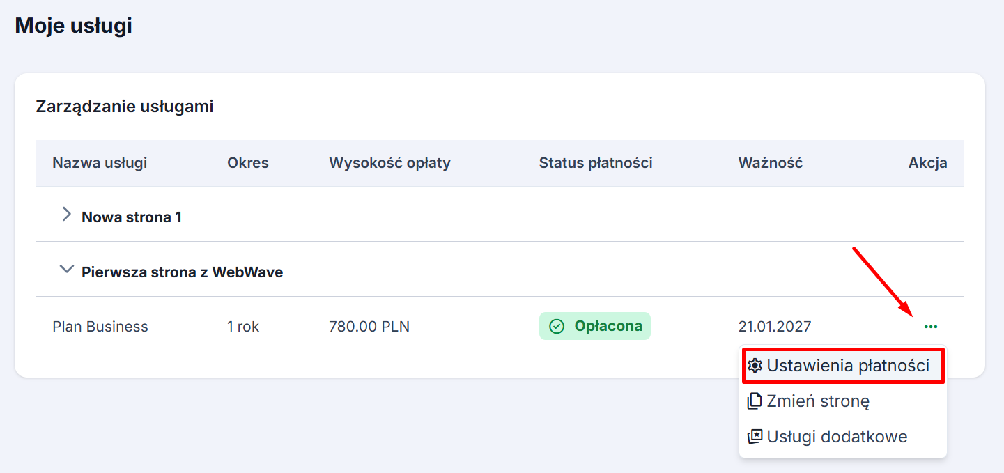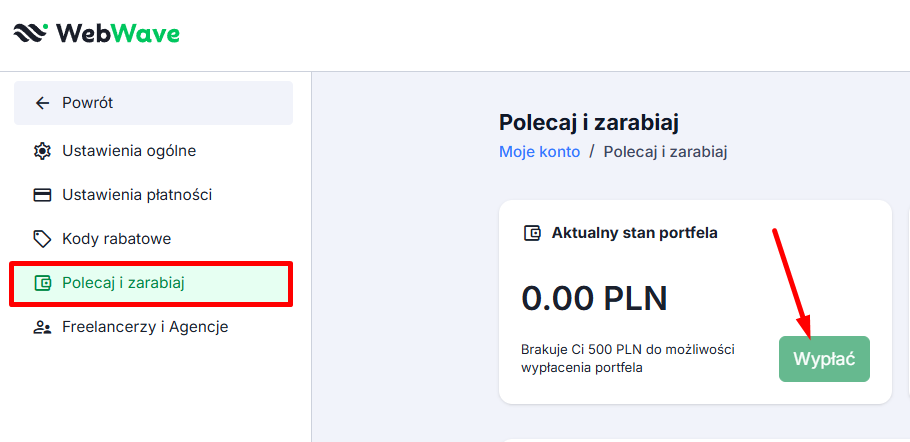 Ważne: Środki zgromadzone w WebWave można wypłacić wyłącznie wtedy, gdy ich suma wynosi co najmniej lub równo 500 zł. W przypadku mniejszych kwot, możesz je przeznaczyć na opłacenie planów, domen lub kont agencyjnych.